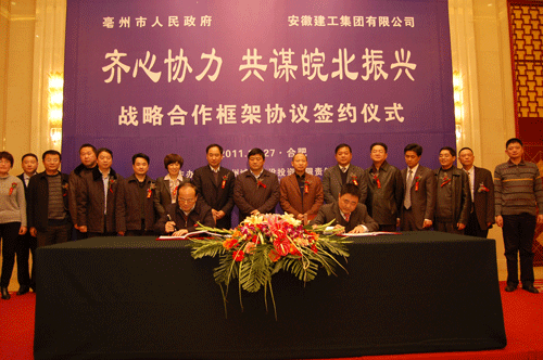 2011年12月27日,由交航公司和亳州城市建設投資有限責任公司共同承辦的安徽建工集團與亳州市政府戰略合作框架協議簽約儀式,在合肥稻香樓賓館隆重舉行。亳州市委書記、市人大常委會主任方春明,市委副書記、市長沈強等市委市政府領導,集團公司董事長、黨委書記胡運成,總經理、副董事長、黨委副書記趙時運等集團領導出席簽約儀式。