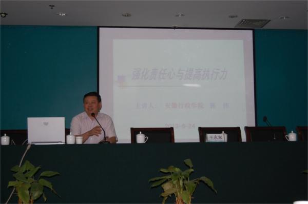 為進一步提高員工的責任心與執(zhí)行力,培育團隊精神,凝聚公司合力,6月25日下午,公司邀請安徽行政學院郭偉教授進行了“強化責任心與提高執(zhí)行力”的專題講座,公司黨委及班子成員、紀委成員、黨支部書記、項目經(jīng)理、項目技術(shù)負責人、工程處負責人及機關(guān)全體員工參加了培訓。