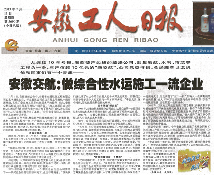 “我和同事們有一個夢想,那就是把安徽交航打造成中部綜合性水運施工一流企業?!闭f到這里,李世龍有些激動了。