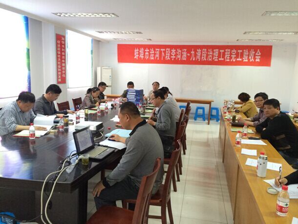 2014年4月24日,固鎮縣淮河支流建設管理局組織蚌埠市澮河下段治理工程施工2標(李溝涵~九灣段河道治理工程)完工驗收,由固鎮縣水務局、固鎮縣河道管理局、固鎮縣財政局、安徽省水利水電勘測設計院、蚌埠市安利水利監理工程有限公司、淮河河道測繪院等相關專家組成驗收工作組,驗收工作組進行了現場查看、查閱資料、聽取相關單位工作匯報,工作組一致認為該工程管理規范、質量滿足規范要求、資料齊全,同意驗收。蚌埠市水利局基建科科長孫荔,蚌埠市水利工程質量監督站站長王承芝應邀參加。公司劉朝發副總經理、李立柱部長、項目部全體工作人員參加了驗收會議。