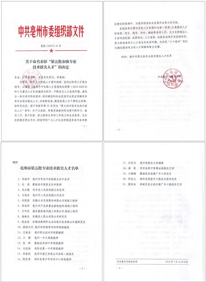 方申柱同志被授予“亳州市第五批專業技術拔尖人才”稱號