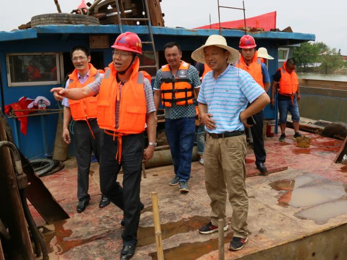 7月14日上午,集團公司副總經理王厚良、安全監察局副主任葛輝在安徽交航公司副總經理方申柱、總經理助理、疏浚分公司總經理董雙武的陪同下來到青弋江南陵縣四七圩倉溪段堤壩抗洪搶險第一線現場指導抗洪搶險工作。王總一行首先登上正在青弋江河道中進行河道清淤的“蛟龍號”,查看施工作業進度,指導安全度汛工作。他與船員們親切交談,詳細了解船舶作業原理、了解施工中遇到的難點,指導船員們在施工過程中在安全方面應該注意的事項,囑咐安徽交航公司要做好船員生活的后勤保障工作。上岸后一行人又驅車趕往南陵縣四七圩倉溪段堤壩抗洪搶險第一線,乘坐沖鋒舟,登上正在潰堤處進行施工作業的抓斗船。登船后,王總與在船上值守的南陵縣水務局局長鄭松淼進行親切交談。鄭局長感謝安徽建工、安徽交航公司對當地政府抗洪救災給予的大力支持,王總表示抗洪搶險是我們國有企業應當承擔的社會責任,是應該的。王總詳細查看了船上作業設備詢問了施工進度,對辛苦作業的職工們給予鼓勵和問候,囑咐職工們在作業同時要注意自身安全,并送上了慰問品和慰問金。職工們感謝集團領導的關心,并紛紛表示將不辱使命,發揚安徽建工人不怕苦不怕累,勇于拼搏的精神,爭取盡早完工,讓災民們早日回到家中。