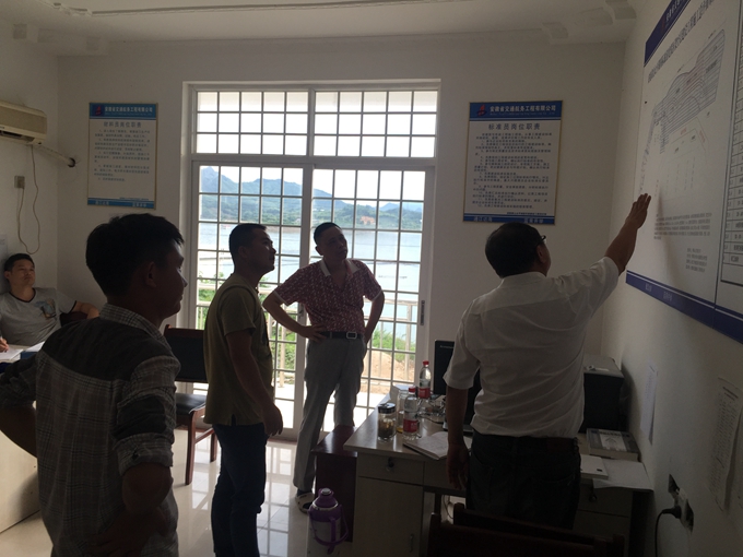 安糧黃山太平湖項目主體工程為水下樁基礎工程和上部混凝土梁板結構工程,工程地處山區涉太平湖水上作業,施工受天氣、地形、水位、水下施工環境等影響因素較大,施工難度較大,公司領導對該項目也格外關注與關心。一到項目部,李董事長一行便直奔工地施工現場,認真聽取了項目負責人對當前施工部署、施工進度及存在的重點、難點等情況匯報,他首先肯定了項目全體人員辛苦與努力,同時提出幾點希望:一是要根據現有施工方案進一步優化,合理有效的組織施工,加快施工進度;二是要規范現場施工管理,確保施工管理的各項工作開展有序,使安全、質量、成本、進度處于受控狀態;三是要加強學習,利用業余時間學習專業知識、學習集團項目管理辦法及相關規章制度文件,認真做好“傳幫帶”工作,以有經驗帶動無經驗,年輕員工向老員工學習,邊工作邊學習,在實踐中快速成長。隨后,公司副總經理劉朝發對下一步的工作計劃作了具體的明確與要求,并叮囑項目部人員要做好夏季高溫防暑降溫工作,注重勞逸結合,要制定夏季高溫防暑降溫工作計劃和應急方案,合理組織施工。