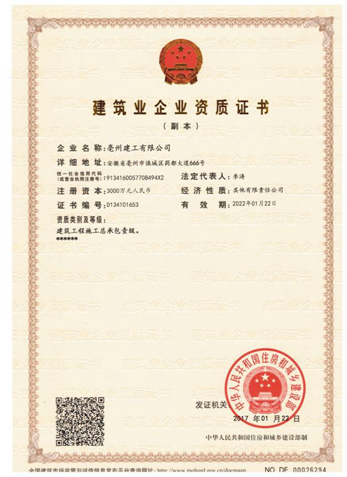 近日,經省住建廳初審、住建部專家認真評審公示公告后,亳州建工有限公司成功晉升“建筑工程施工總承包壹級資質”,實現了企業施工總承包資質水平的提升,為企業實現“十三五規劃發展目標”奠定堅實基礎。