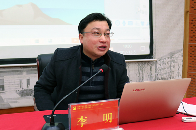黨的十九大精神安徽“百人宣講團”成員、安徽省學術和技術帶頭人后備人選、教育部“全國高校思想政治理論課教學能手”、安徽大學馬克思主義學院教授、博士生導師李明以《把握新時代 領會新思想 開啟新征程》為題,全方位、多角度、深層次解讀了黨的十九大報告。李教授從為什么能夠進入新時代、進入新時代的意義、新時代的內涵、新時代的主要矛盾、新時代的使命等方面闡釋了“新時代”;從形成條件、主要內容、基本方略、精神實質等方面分析了“新思想”;從戰略安排方面剖析了“新征程”。