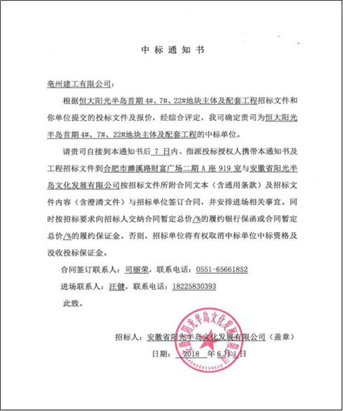 6月1日,亳州建工收到大型知名房企恒大地產集團有限公司匠心打造的旅居巨作——“恒大陽光半島項目”首期4#、7#、22#地塊主體及配套工程中標通知書,中標金額3.6億元。