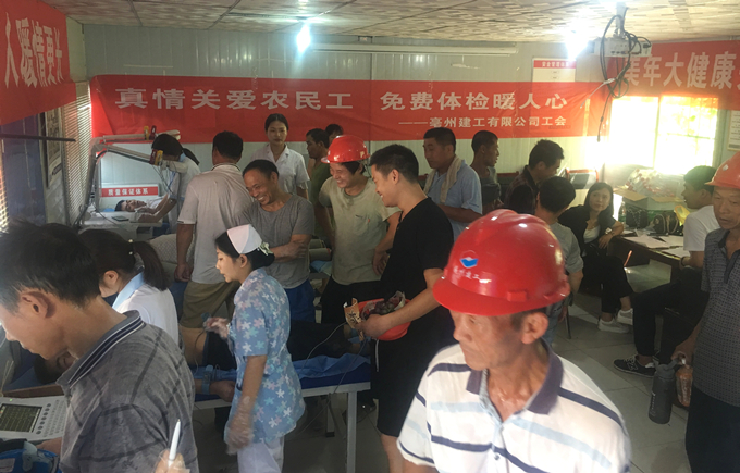 為進(jìn)一步關(guān)心關(guān)愛農(nóng)民工,打造平安工地,7月17日至19日,亳州建工工會(huì)聯(lián)合美年大健康體檢中心為各在建項(xiàng)目300余名農(nóng)民工進(jìn)行了免費(fèi)體檢。