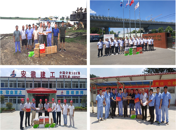 7月19日至8月上旬,公司紀委書記、工會主席李楊,副總經理劉朝發、侯力分別帶隊前往蒙城、淮北、淮南、黃山、蕪湖、合肥等地區慰問了14個項目部、3個船隊,為奮戰在一線的職工送去防暑降溫用品。因船員工作生活條件艱苦,公司工會額外給3個船隊配備了急救藥箱、健身器材。