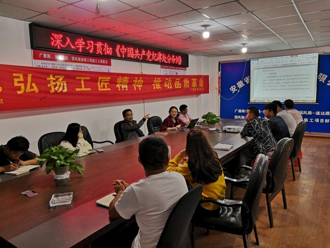 10月9日,廣德路項目部積極響應上級要求,召開了黨支部擴大會議,組織項目部全體職工認真學習新修訂的《中國共產(chǎn)黨紀律處分條例》。