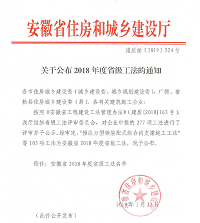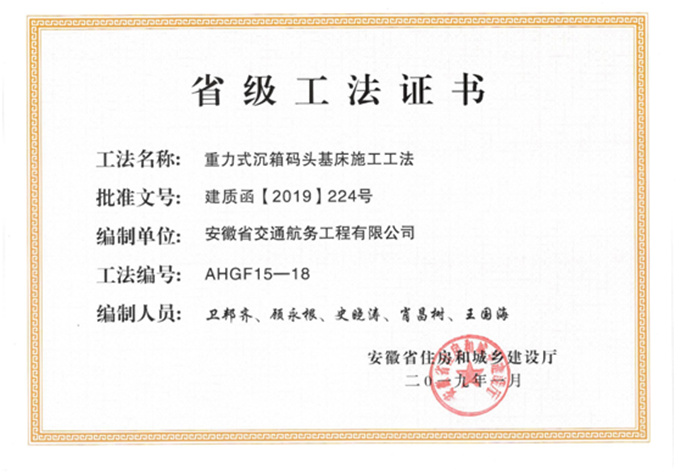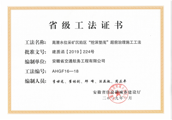 根據《關于公布2018年度省級工法的通知》(建質函【2019】224號),公司組織編制的《高潛水位采礦沉陷區“挖深墊淺”超前治理施工工法》和《重力式沉箱碼頭基床施工工法》獲得2018年度省級工法。