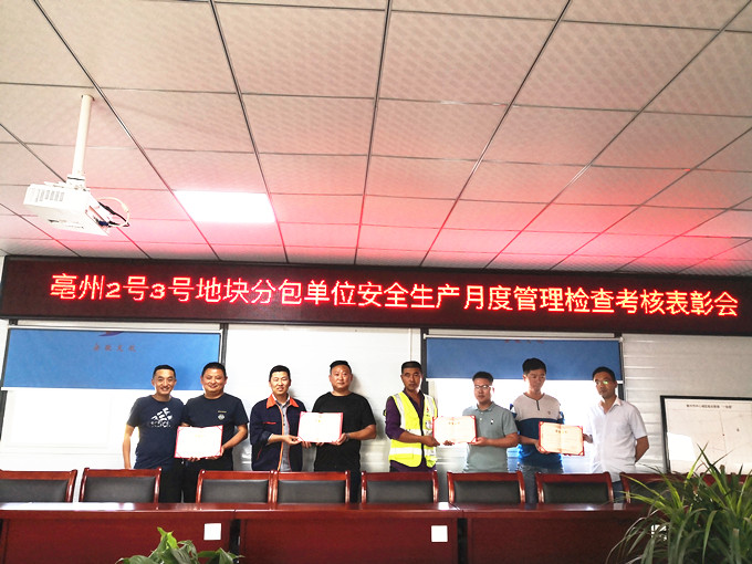 亳州PPP項目部根據相關法規、條例及制度,并結合項目的實際情況,通過成立項目分包單位月度考核安全生產考核領導小組,每月由考核小組組長史冠蘭帶隊對施工現場各道路箱涵處施工進展情況、質量情況、安全防護工作落實情況進場檢查。針對檢查中發現存在的問題形成評比通報,責令要求限時整改,并對于安全管理工作落實較好的分包隊伍及安全員及時進行表彰。