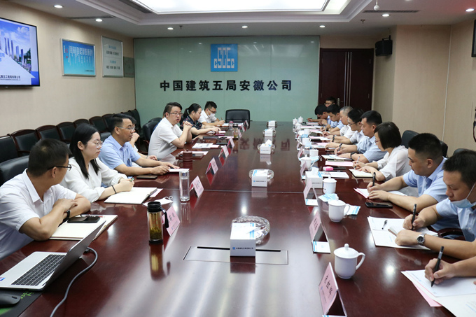 會上,雙方相關職能部門負責人分別就各自負責的領域進行了深入友好交流。考察期間,公司考察組在中建五局安徽公司副總經理、總工程師陳洪根陪同下實地參觀了中建五局安徽公司承建的合肥市產融中心2#、3#地塊項目。
