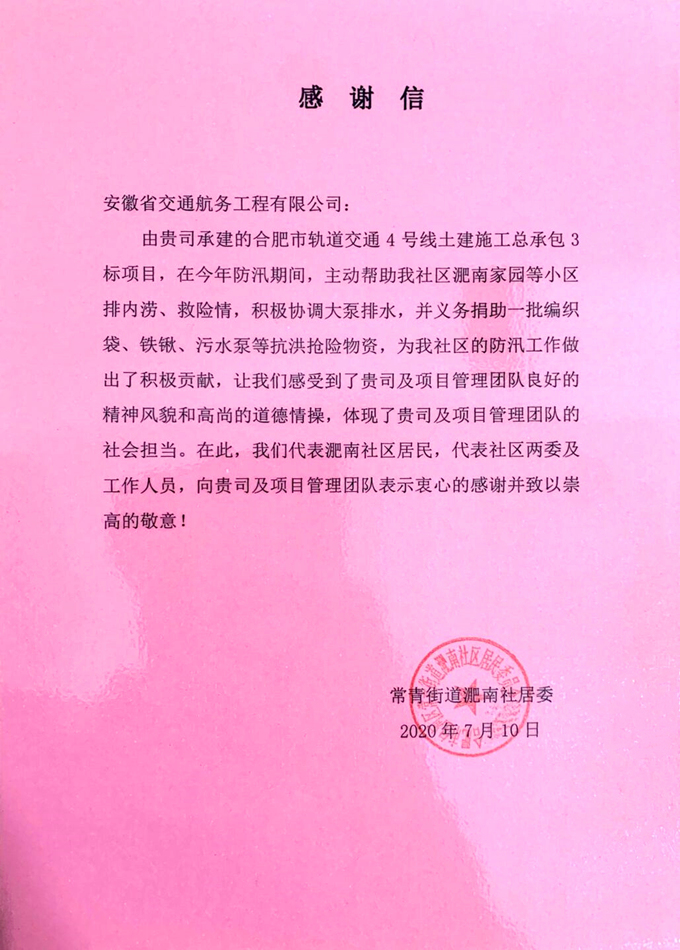 7月28日早上,安徽交航合軌4號線TJ03標(biāo)項目部收到一封來自駐地社居委送來的感謝信,對項目部主動幫助社區(qū)排內(nèi)澇、救險情以及義務(wù)捐助防汛物資的志愿服務(wù)行動給予了高度贊揚(yáng),并表達(dá)了由衷感謝。