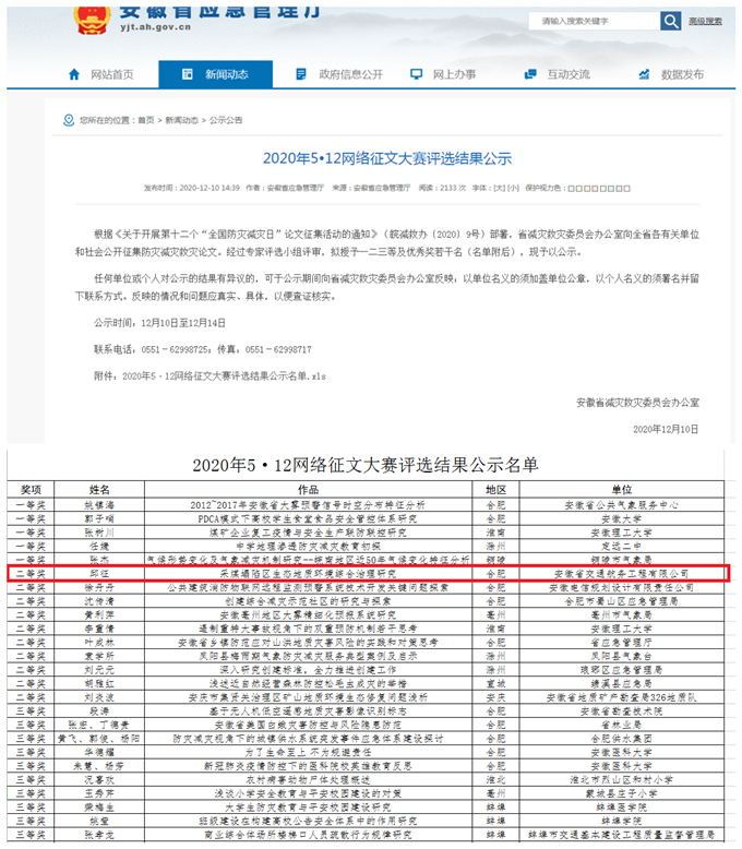 近日,從安徽省應急管理廳網站獲悉,全省防災減災救災論文評選結果正式揭曉,安徽交航公司報送的《采煤塌陷區生態地質環境綜合治理研究》論文喜獲二等獎。