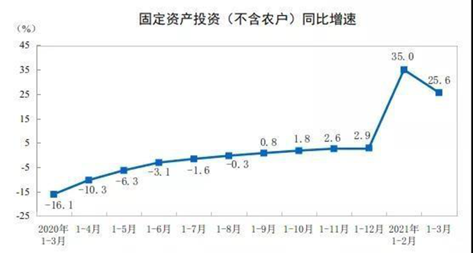 1-3月份,全國固定資產投資(不含農戶)95994億元,同比增長25.6%;比2019年1-3月份增長6.0%,兩年平均增長2.9%;經季節調整后與去年10-12月份環比增長2.06%。其中,民間固定資產投資55022億元,同比增長26.0%。從環比看,3月份固定資產投資(不含農戶)增長1.51%。