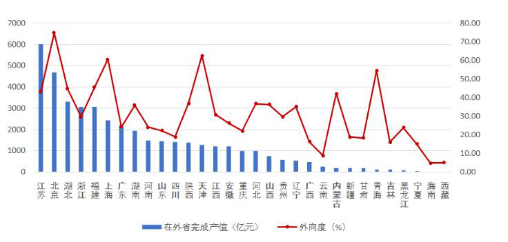 從外向度(即本地區在外省完成的產值占本地區建筑業總產值的比例)來看,排在前三位的地區是北京、天津和上海,分別為74.76%、62.56%、60.44%。此外,外向度超過30%的還有青海、福建、湖北、江蘇、內蒙古、陜西、河北、山西、湖南、遼寧、江西、福建、廣東等13個地區(圖4)。