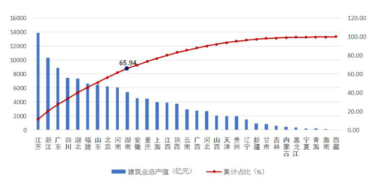 除江蘇、浙江外,總產值超過5000億元的還有廣東、四川、湖北、福建、山東、北京、河南、湖南8個地區,上述10省市完成的建筑業總產值占全國建筑業總產值的65.94%(圖1)。