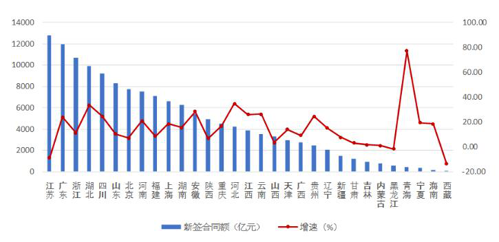 簽合同額均超過10000億元,分別為12763.52億元、11925.7億元、10702.53億元。此外,新簽合同額超過6000億元的還有湖北、四川、山東、北京、河南、福建、上海、湖南等8個地區(圖3)。新簽合同額同比增長最快的是青海,達到77.15%。此外,河北、湖北、安徽、云南、江西、四川、貴州、廣東、河南等9個地區的增幅均超過20%。西藏、江蘇、黑龍江3個地區新簽合同額出現負增長,其中西藏的負增長超過了10%。
