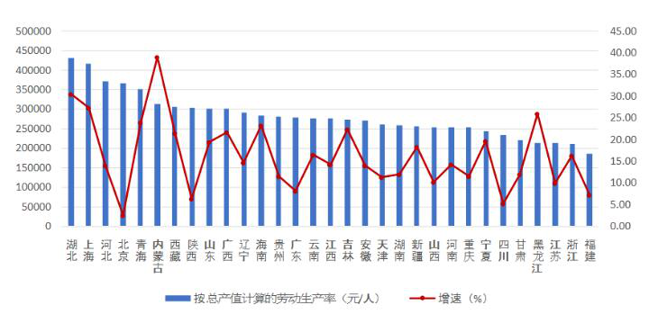 2021年上半年,各地區按建筑業總產值計算的勞動生產率均保持增長。勞動生產率排序前三位的地區是湖北、上海、河北,分別為432475元/人、416370元/人、371176元/人。勞動生產率增幅超過15%的是內蒙古、湖北、上海、黑龍江、青海、海南、吉林、廣西、西藏、寧夏、山東、新疆、云南、浙江等14個地區(圖6)。