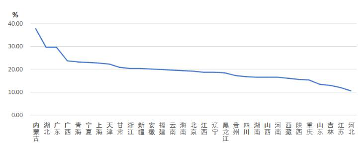 從各地區建筑業總產值增長情況看,所有地區的建筑業總產值較上年同期都有不同幅度的增長。其中,內蒙古的增幅最大,達到了37.93%。此外,湖北、廣東、廣西、青海、寧夏、上海、天津、甘肅、浙江、新疆、安徽等11個地區的增幅均超過20%(圖2)。