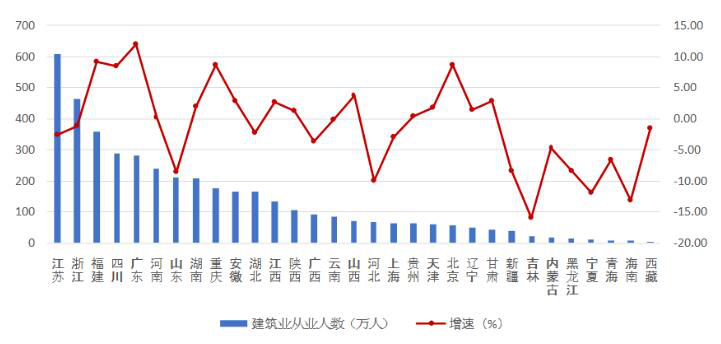 2021年上半年,全國建筑業從業人數超過百萬的地區共13個。江蘇、浙江依然是從業人數大省,人數分別為608.55萬人和464.95萬人。此外,福建、四川、廣東、河南、山東、湖南等6地區從業人數均超過200萬人。
