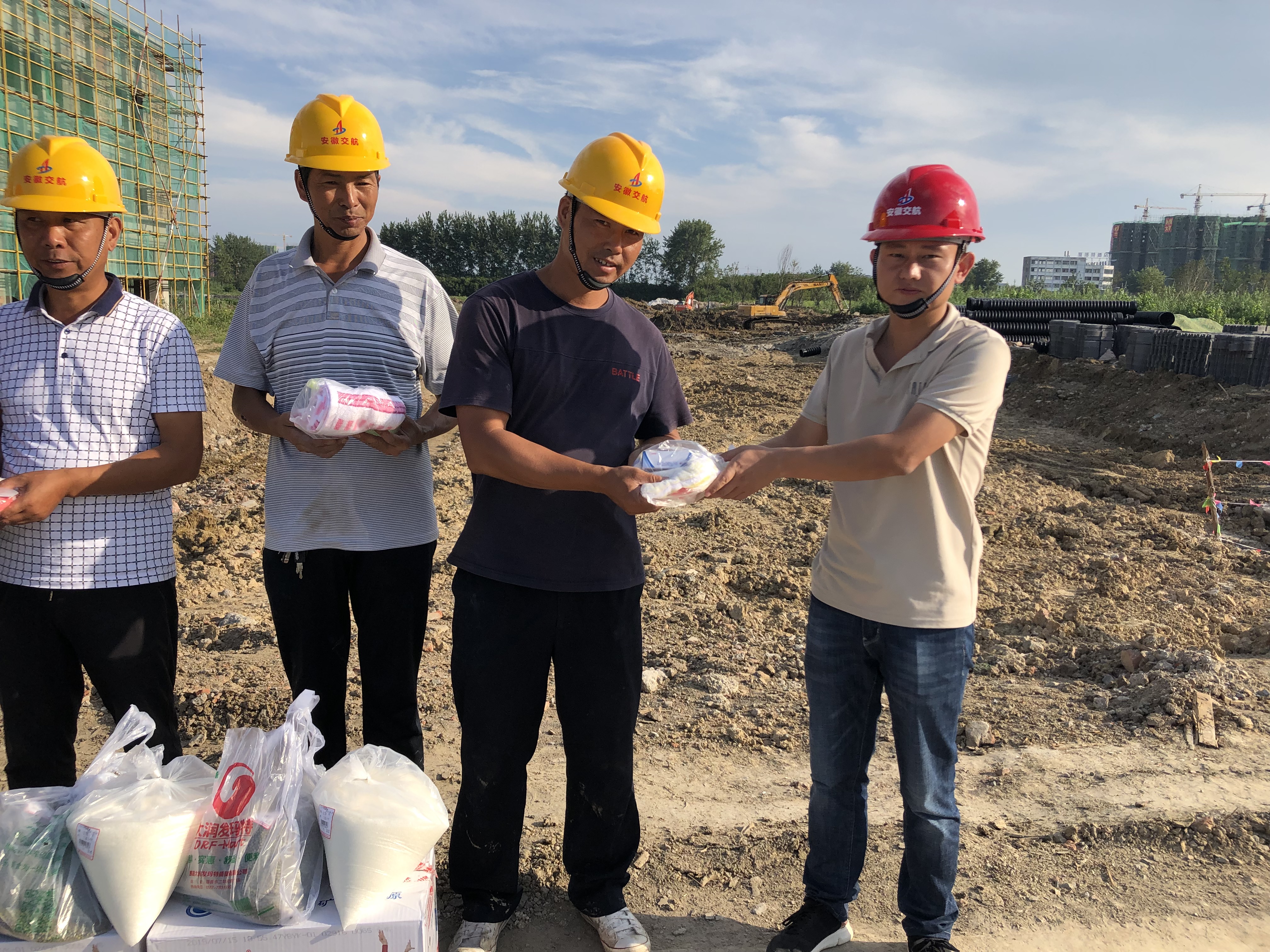 大暑雖已過去,可氣溫依舊炎熱,為了加緊工期,現場施工人員起早貪黑的在工作崗位上辛苦勞作。多金泗縣國際汽車城EPC項目黨支部開展了送清涼黨日活動,為奮戰在一線的民工兄弟們送去礦泉水、綠豆、花露水等防暑降溫物品,感謝他們為施工生產所做的努力和貢獻。