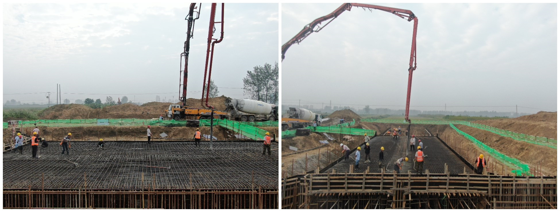 自儀式啟動以來,為快速掀起大干快干熱潮,確保年底完成既定進度產值,泗縣長三角產業園項目緊緊圍繞項目年度生產任務,秉持“工期就是效益”的理念,主動對標長三角一體化發展城鄉建設示范性勞動和技能競賽,充分發揮主人翁精神和主力軍作用,確保項目工期、產值等各項任務圓滿實現。今年9月9日,在炎熱高溫天氣下,泗縣長三角產業園項目龍河路箱涵,在超長雨季間歇期完成的底板混凝土澆筑、頂板及側墻鋼筋綁扎、模板支設,經過監理單位驗收合格,終于迎來了頂板及側墻混凝土的澆筑。由于混凝土澆筑方量大,項目部提前向商混站報備所需泵車、混凝土標號、方量,預計澆筑時間等計劃。9日清晨6點鐘,項目部技術管理人員到達磅房和施工位置,指揮泵車過磅,安排工人測溫及班前培訓。在施工過程中,項目部技術管理人員時刻與工人一起,送藥送水,極大地鼓舞了廣大工人的生產熱情,經過八個小時連續奮戰,澆筑任務圓滿完成。