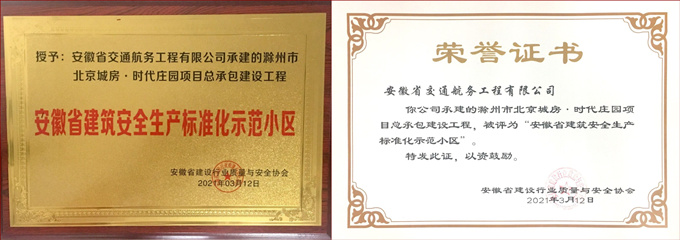 滁州時代莊園項目榮獲“安徽省建筑安全生產標準化示范小區”稱號