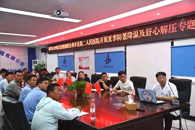 培訓(xùn)環(huán)節(jié),項(xiàng)目部特邀利辛縣第二人民醫(yī)院楊文成醫(yī)生,就開(kāi)展夏季防暑降溫及舒心解壓知識(shí)進(jìn)行了專(zhuān)題講座。楊文成醫(yī)生,先是就中暑的原因、發(fā)病機(jī)理做一個(gè)簡(jiǎn)單講解,然后針對(duì)以上原因、如何預(yù)防以及應(yīng)急方式做了一個(gè)細(xì)致說(shuō)明。