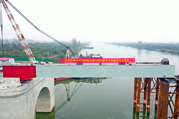 10月28日下午4點10分,隨著一節重達53噸的鋼箱梁穩穩地架設到馬胡橋4#主墩支座位置上,利辛S247馬胡橋項目首節鋼箱梁架設宣告成功,標志著馬胡橋進入鋼箱梁“拼積木”階段,主橋上部結構施工將進入“快車道”。