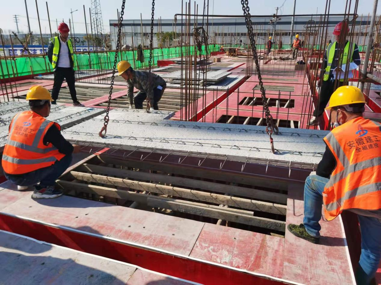 11月15日上午,全椒縣大墅產業新城電商物流園裝配式EPC項目10#樓首層裝配式疊合樓板順利吊裝。