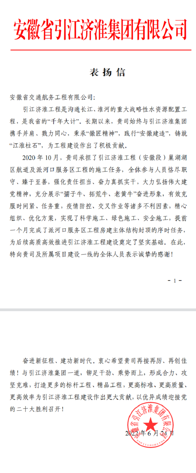 近日,安徽交航收到安徽省引江濟(jì)淮集團(tuán)有限公司發(fā)來的表揚(yáng)信,對安徽交航引江濟(jì)淮工程(安徽段)巢湖區(qū)航道及派河口服務(wù)區(qū)工程項(xiàng)目在項(xiàng)目管理、工程進(jìn)度、疫情防控、安全文明施工等方面的優(yōu)異表現(xiàn)予以表揚(yáng)和感謝。
