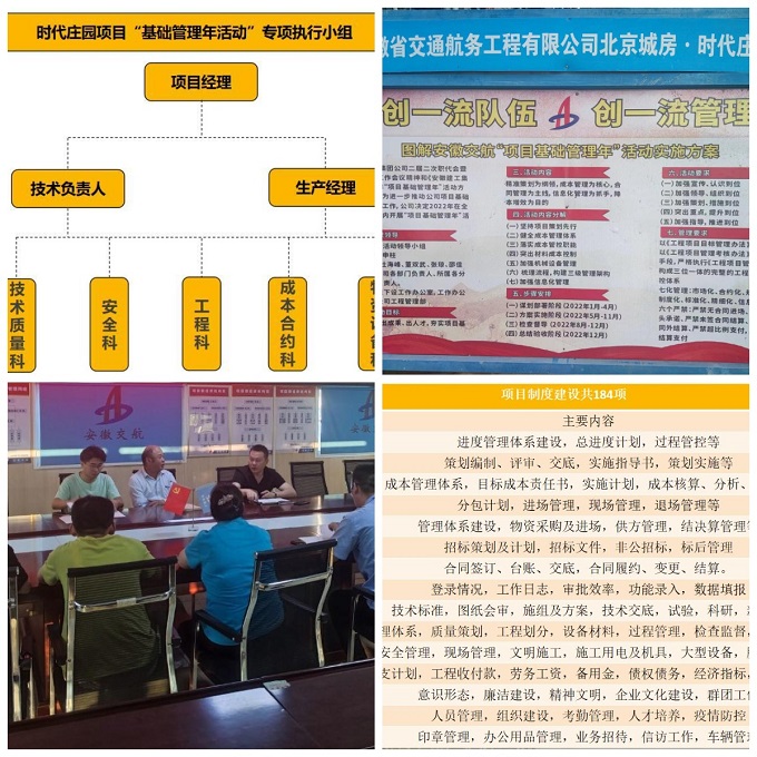 為深入貫徹落實集團二屆二次職代會暨2022年工作會議精神和安徽交航公司三屆四次職代會暨三屆二次工代會精神,根據集團公司“項目基礎管理年”活動方案和安徽交航基礎管理活動年啟動會要求,進一步推動項目基礎管理建設,時代莊園項目部成立專項執行小組,啟動“項目基礎管理年”第一階段掛圖作戰暨基礎管理工作自查自糾行動。