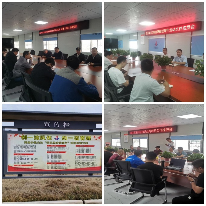 開展學習會議,宣傳活動精神。公司“項目基礎管理年”活動方案發布后,2021年內江市東興區道路基礎設施建設工程項目部立即召開專題會議傳達活動精神。項目部還在宣傳欄中制作了“項目基礎管理年”專題展板,以此來對活動精神進行傳達與宣傳。
