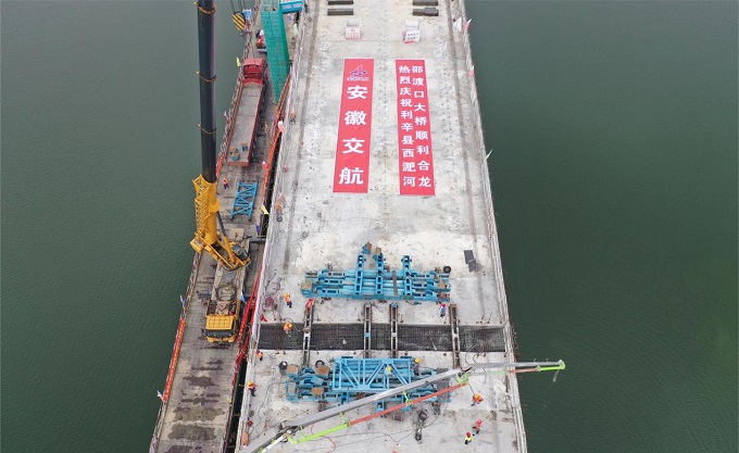 兩年磨一劍,天塹變通途。自2020年12月18日開工以來,在工期緊、任務重、新冠肺炎疫情以及今年夏季高溫天氣的困難條件下,項目部全體參建職工始終踐行安徽交航“團結、拼搏、求實、創新”的企業精神,發揚“特別能吃苦,特別能戰斗”的企業作風,恪守公司“重合同、守信用”和“質量第一、用戶至上”的服務宗旨,攻堅克難、踔厲奮發。項目部科學組織、合理施工,在六百多個日日夜夜艱苦鏖戰下,邵渡口大橋主橋順利合龍,主橋合龍混凝土澆筑并于9月14日下午6點10分澆筑完成,邵渡口大橋項目關鍵節點任務圓滿完成。