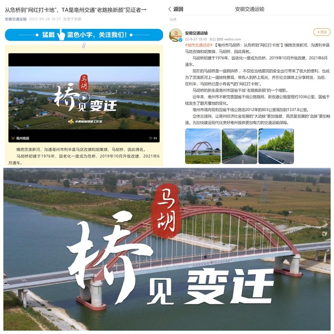 近日,安徽交通運輸廳微博和公眾號分別轉發亳州晚報對安徽交航公司改建利辛縣馬胡橋專題報道。馬胡橋改建工程于2019年10月18日開工建設,2021年6月8日完成交工驗收。在安徽交航公司的雕琢之下,馬胡橋從一座年久失修、無人問津的危橋華麗轉身當地“網紅打卡地”,老橋換新顏,不僅成為居民出行的高效通道,也成為茨淮新河的一道獨特風景,有效增強了居民群眾的獲得感、幸福感。