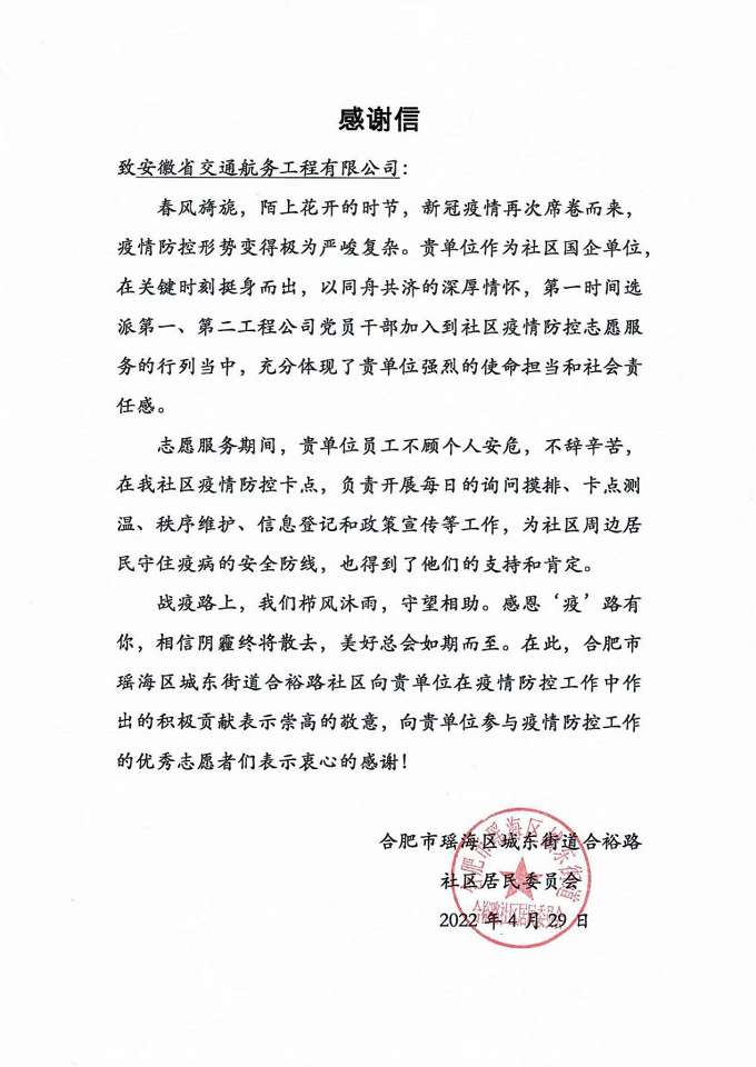 “第一時間選派第一、第二工程公司黨員干部加入到社區疫情防控志愿服務的行列當中,充分體現了貴單位強烈的使命擔當和社會責任感。”4月29日,公司收到了一封來自合肥市瑤海區城東街道合裕路社區的感謝信,信中對公司積極參與社區疫情防控工作表示由衷感謝。