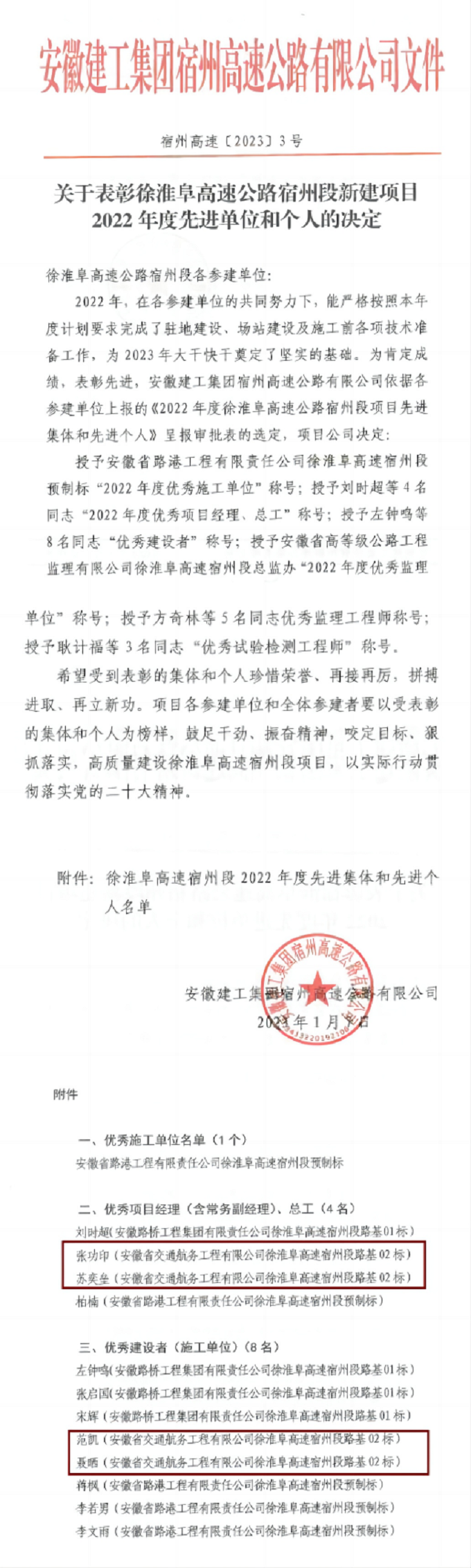近日,安徽建工集團(tuán)宿州高速公路有限公司對所參建各單位過去一年在推動徐淮阜高速公路宿州段建設(shè)中作出的貢獻(xiàn)予以集中表彰,安徽交航徐淮阜高速宿州段路基02標(biāo)項(xiàng)目四人受到表彰,張功印、蘇奕壘獲“2022年度優(yōu)秀項(xiàng)目經(jīng)理、總工”稱號,范凱、聶曬獲“優(yōu)秀建設(shè)者”稱號。
