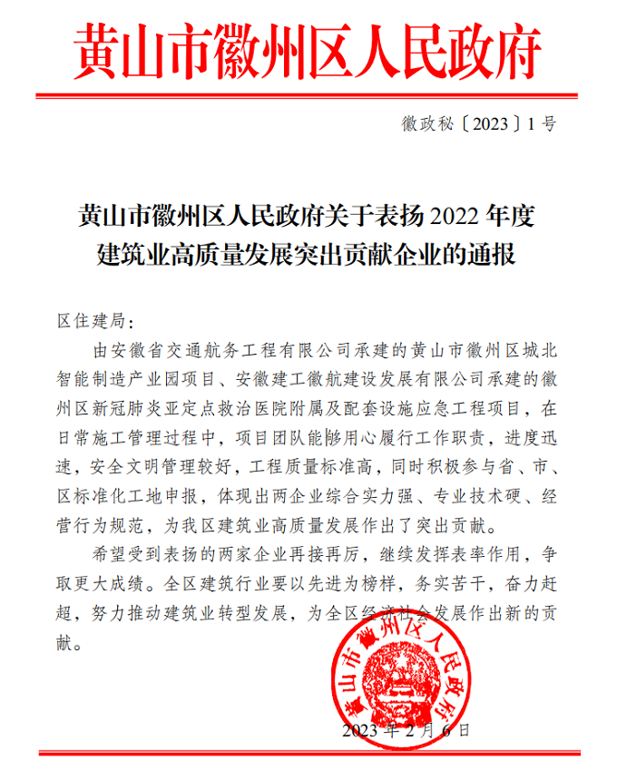 近日,黃山市徽州區人民政府發文通報表揚我公司承建的徽州區產業園項目及徽州區新冠肺炎亞定點救治醫院項目。