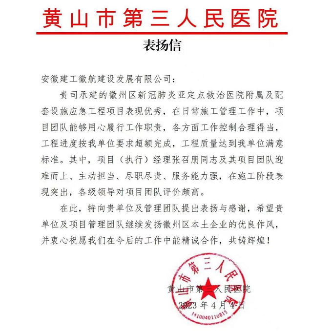 近日,安徽建工徽航建設發展有限公司所承建的徽州區新冠肺炎亞定點救治醫院附屬及配套設施應急工程項目收到黃山市第三人民醫院發來的表揚信,信中對項目施工管理、工程進度和工程質量予以充分肯定,并對公司及項目管理團隊提出表揚和感謝。