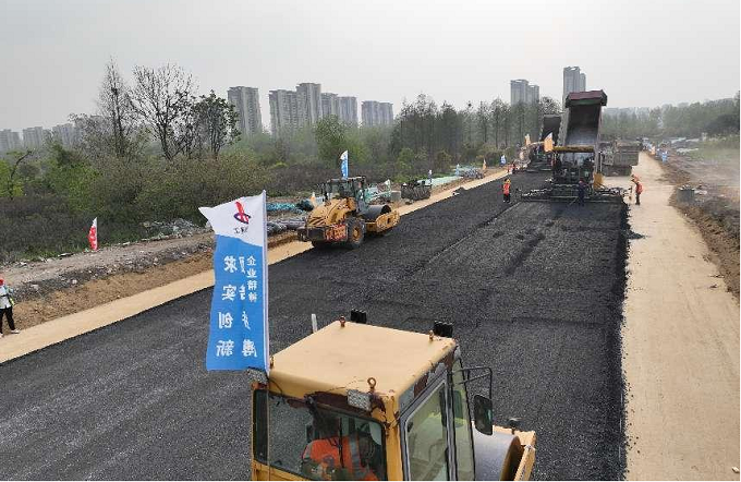 4月11日中午,青海路項目施工現場機械轟鳴、彩旗飄揚,項目道路水泥穩(wěn)定碎石試驗段順利動工,大型攤鋪機、壓路機、輸料車輛忙碌而有序地實施鋪設作業(yè),一條灰色的路面慢慢向前延伸。