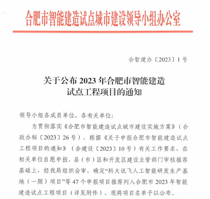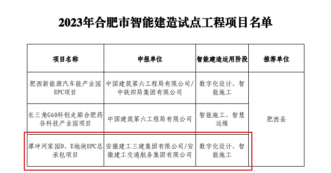 近日,合肥市智能建造試點城市建設(shè)領(lǐng)導(dǎo)小組辦公室公布2023年合肥市智能建造試點工程項目名單,建工交航承建的潭沖河家園D、E地塊EPC總承包項目位列其中,標(biāo)志著公司運用智能建造技術(shù)在項目施工、生產(chǎn)、管理等全過程數(shù)字化應(yīng)用方面取得了階段性成果。
