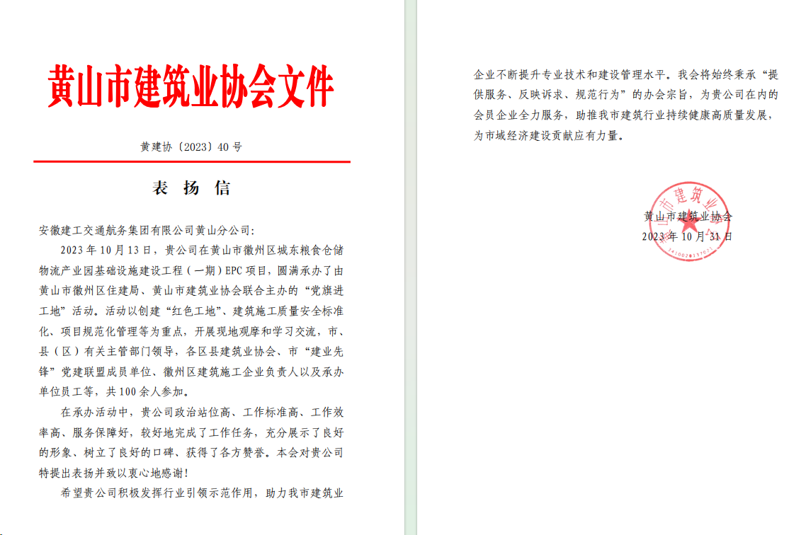 10月31日,建工交航黃山分公司收到黃山市建筑業(yè)協(xié)會(huì)發(fā)來(lái)的表?yè)P(yáng)信。信中對(duì)黃山分公司在所屬徽州區(qū)城東糧食倉(cāng)儲(chǔ)物流園項(xiàng)目圓滿承辦“黨旗進(jìn)工地”活動(dòng)予以充分肯定。