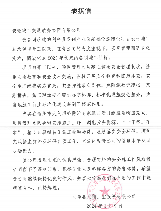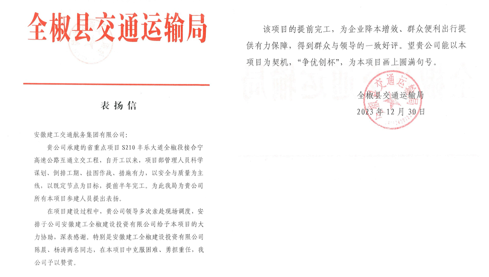 近日,公司承建的馬(合)鋼項目、S210豐樂大道全椒段接合寧高速公路互通立交項目和利辛雙創產業園項目喜獲表揚信。