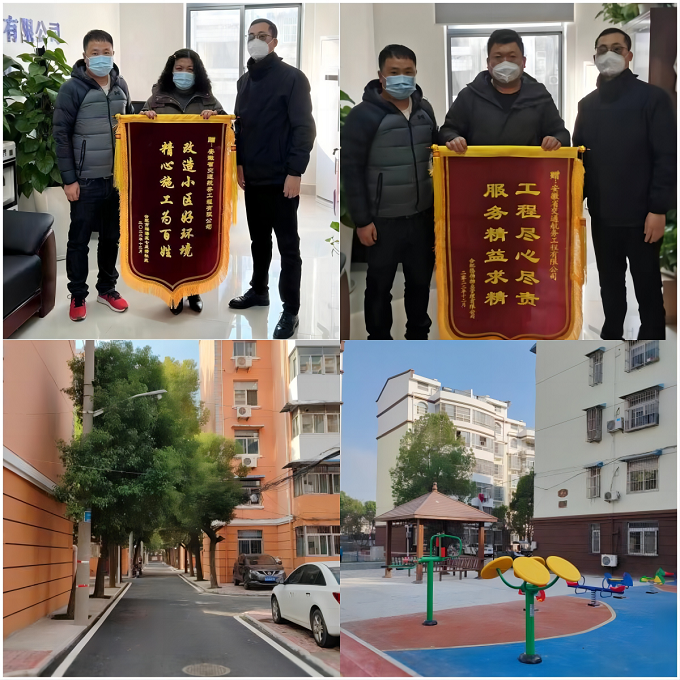 近日,由安徽交航公司負責施工的銀都苑、裕興苑小區、匯馨小區、萬泰花園、五里井合浦南村的社區和物業代表向安徽交航公司贈送“工程盡心盡責 服務精益求精”、“改造小區好環境 精心施工為百姓”錦旗,對我公司承接的瑤海區2022年(第二批)21個老舊小區環境綜合整治工程5標段項目工作表示滿意和認可。第二工程公司黨支部副書記鄭鵬、項目經理張飛龍與社區、物業代表合影留念。