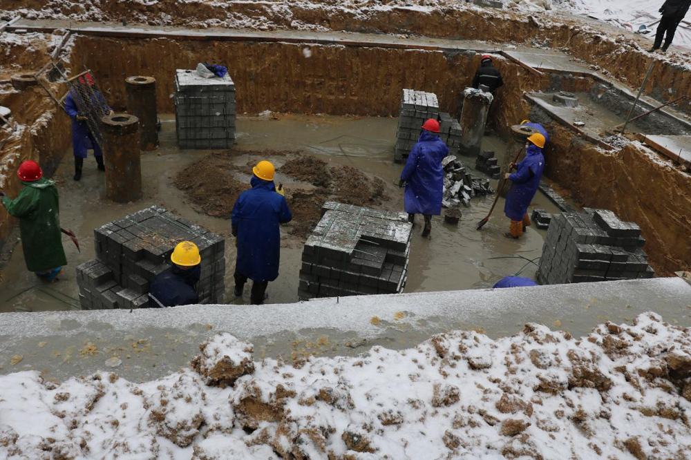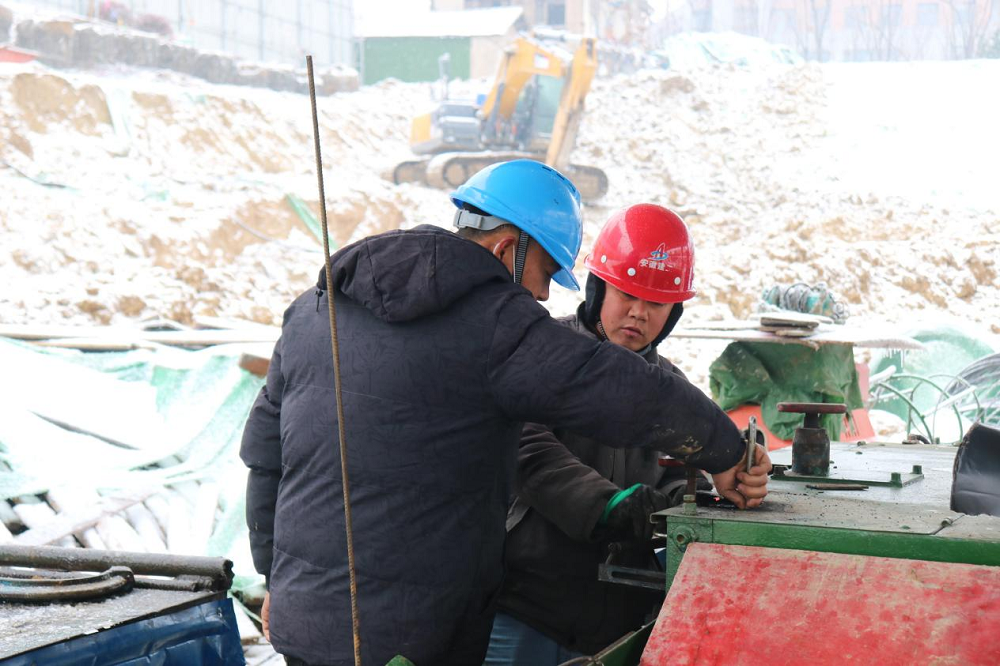 項目部結合實際開展安全施工教育培訓,有效推進現場樁芯鋼筋加工制作、礎磚胎膜抹灰、砌筑、道路鋪設磚渣、地庫承臺樁芯澆筑等生產工作,確保降雪降溫不降產。