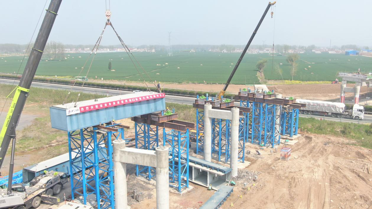 4月8日,一塊長17.38米、重46.45噸的“鋼鐵巨獸”穩穩的落在徐淮阜高速宿州段路基工程02標孫圩子互通GK1+275.5匝道橋的支架上。該鋼箱梁吊裝完成標志著項目正式進入鋼箱梁快速施工階段。