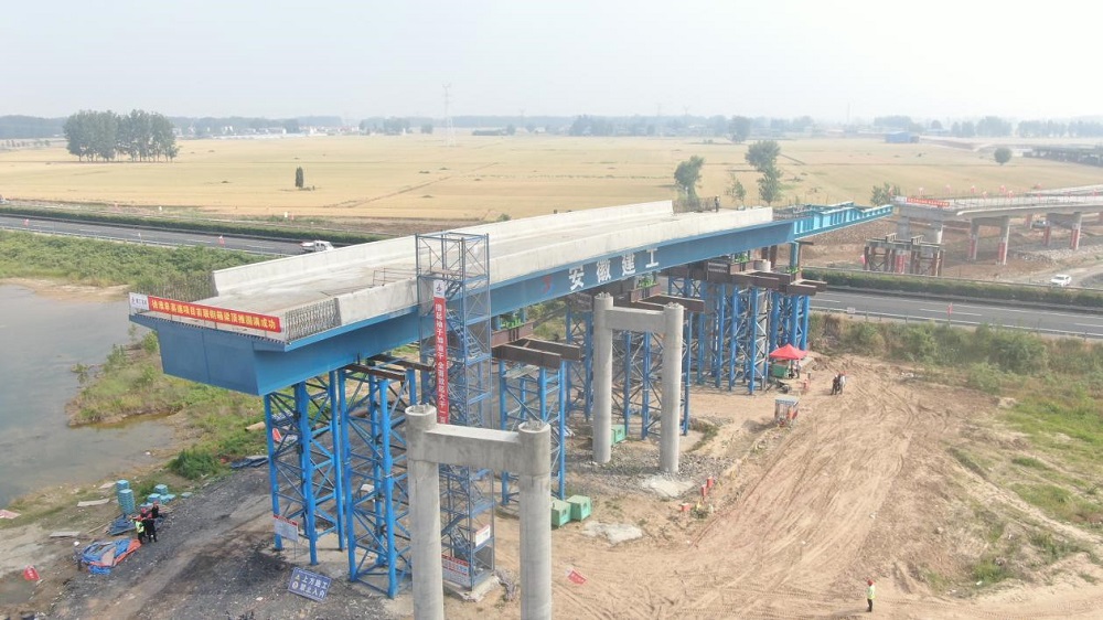 5月22日,隨著步履式頂推設(shè)備的平穩(wěn)運(yùn)行,徐淮阜高速宿州段路基工程02標(biāo)項(xiàng)目孫圩子互通上跨連霍高速G匝道鋼箱梁頂推施工順利拉開了序幕,長(zhǎng)60米,寬10.5米,重達(dá)近400噸的曲線鋼箱梁在三維液壓千斤頂?shù)淖饔孟缕椒€(wěn)頂升、順利啟動(dòng),標(biāo)志著徐淮阜高速與既有線連霍高速的交通轉(zhuǎn)換銜接施工正式開始,徐淮阜高速宿州段項(xiàng)目建設(shè)全面進(jìn)入沖刺階段。