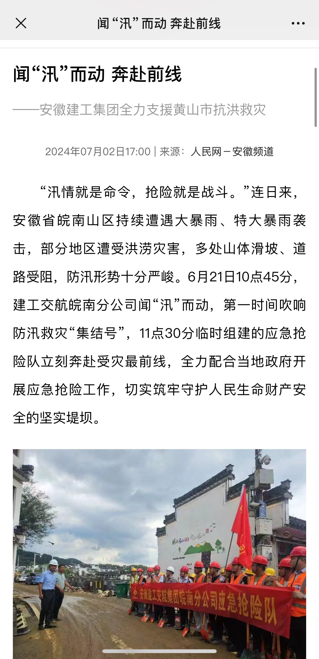 人民網(wǎng)安徽頻道以《聞“汛”而動 奔赴前線——安徽建工集團全力支援黃山市抗洪救災(zāi)》為題報道建工交航皖南分公司的搶險工作。