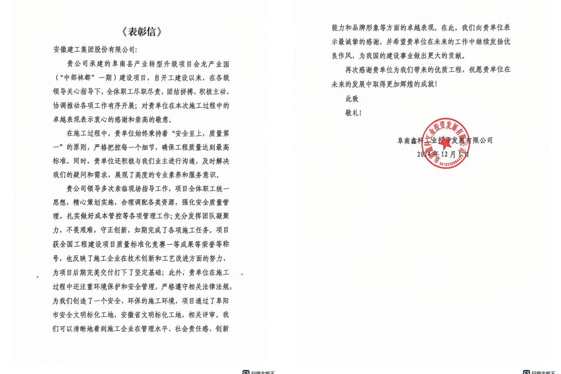信中指出,安徽建工王家壩建投在項(xiàng)目建設(shè)過程中,全面落實(shí)阜南縣委、縣政府工作要求,扎實(shí)推進(jìn)重點(diǎn)項(xiàng)目建設(shè),取得積極成效。為全縣推進(jìn)高質(zhì)量發(fā)展做出積極貢獻(xiàn),為阜南縣重點(diǎn)項(xiàng)目建設(shè)再立新功。